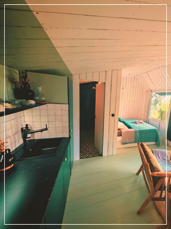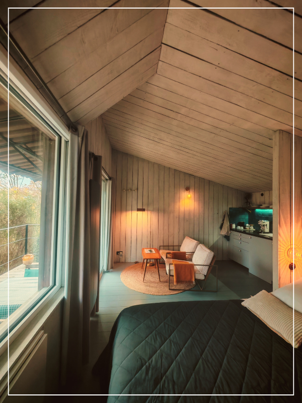 Le soleil se couche sur la cabane Lève-Tard et son jacuzzi nordique privatif, de style rétro-chic elle est tout confort.